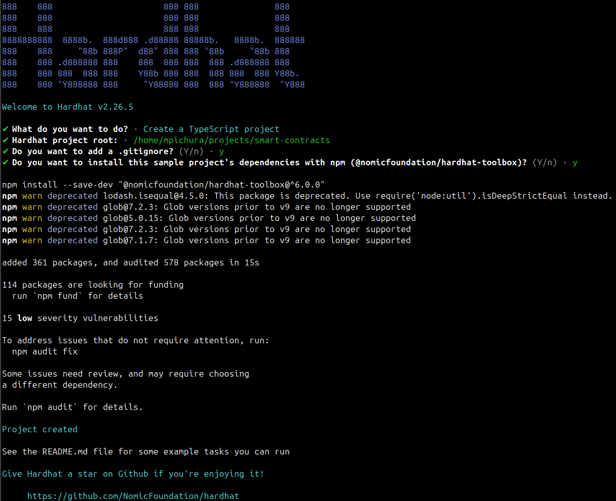 y - Do you want to install this sample project's dependencies with npm (@nomicfoundation/hardhat-toolbox)?