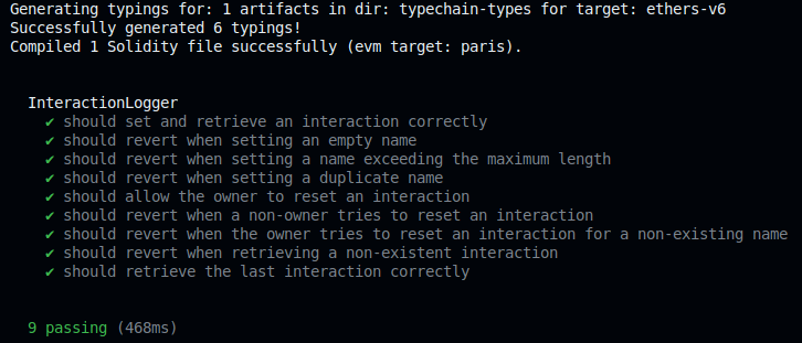 npx hardhat compile && npx hardhat testIf everything works, you should see output similar to:
